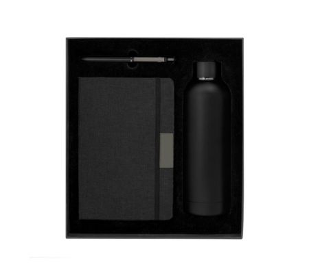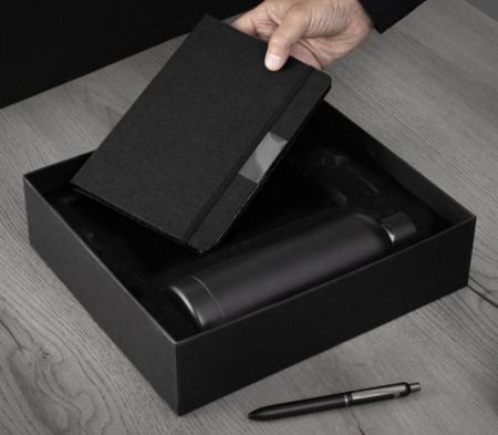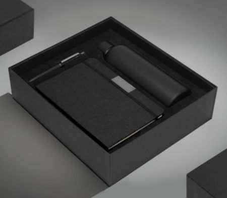- 1 libreta color negro jaspeado de 14 x 21 x 1,5 cm. Con placa metálica color gun de 5 x 2 cm. Tapa de cartón 300g recubierta en RPET 310. Interior de 80 hojas rayadas de 70g. Encuadernación cosida y cierre con banda elástica color negro.