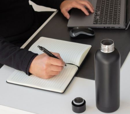 - 1 botella térmica color negro mate de 7,4 x 22 cm. y 500 ml. Doble pared, sellada al vacío. Tecnología vacuum. Interior en acero inoxidable 304 y exterior en acero inoxidable 201. Tapa a rosca de acero con anillo de silicona.
